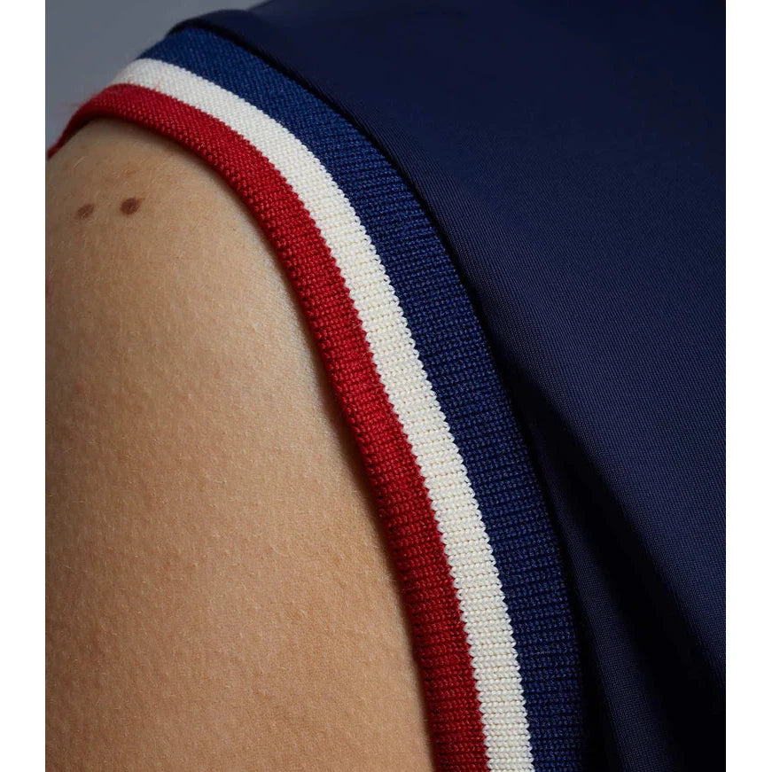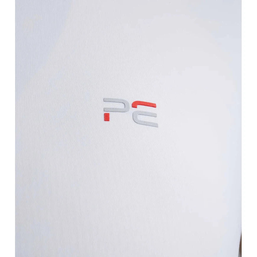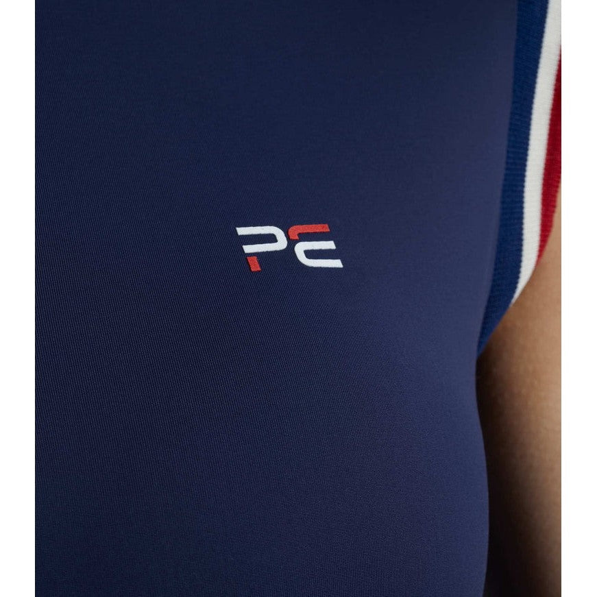 A decorative curve stand collar is finished with a 1/4 zip, allowing for easy closure. PE brand colour stripes trim the front and sleeve edge for a sporty touch.