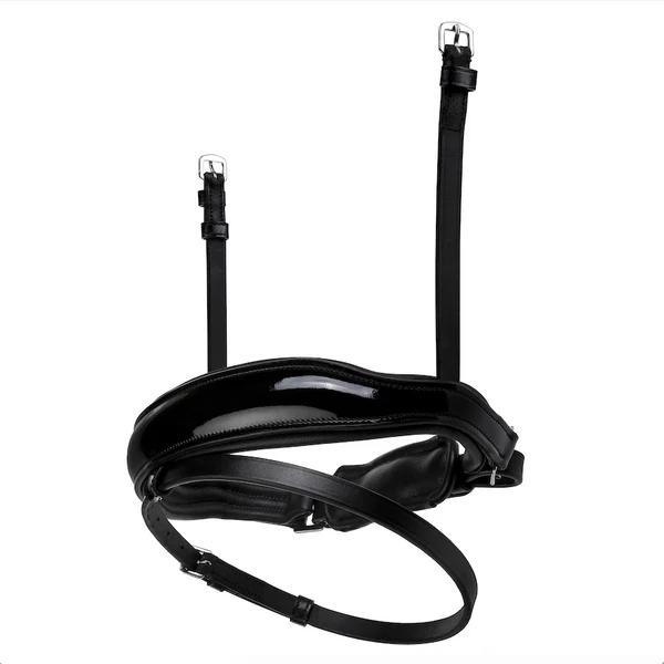 Curved black patent leather hanoverian noseband with gel-padding and butter soft premium leather. This noseband curves slightly up over the bridge of the horse's nose, enabling the higher fit and wider pressure distribution while leaving space for the sensitive nerves on the side of the cheek bones.