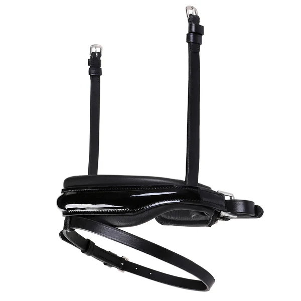 Anatomically shaped, it arcs up to allow space for the bit and is a high-shine patent leather.
