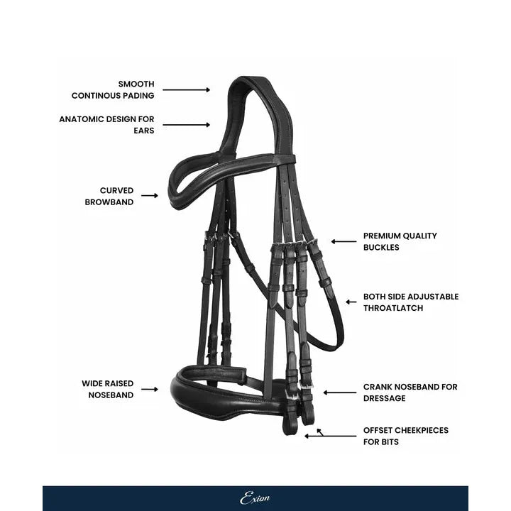 Crafted with precision and purpose, the Exion Double Bridle features the shape of our W-shaped anatomical crownpiece, with four straps, specially designed for proper double bridle assembly and fit. Built in accordance with USEF & FEI Dressage rules, the W crownpiece provides a smooth, continuous padding that flows with the leather’s anatomical shape ensuring generous ear clearance while maintaining correct double bridle fitting.