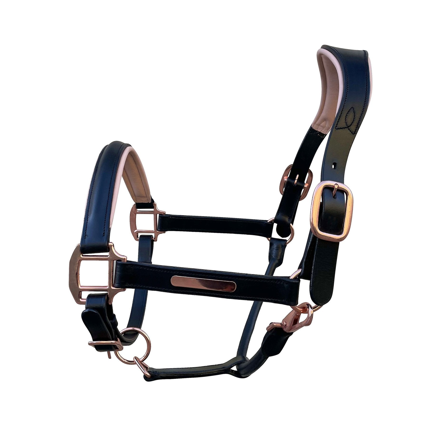 The halter is adorned with premium rose gold fittings and a personalised nameplate, adding a touch of glamour that glimmers in the sunlight.