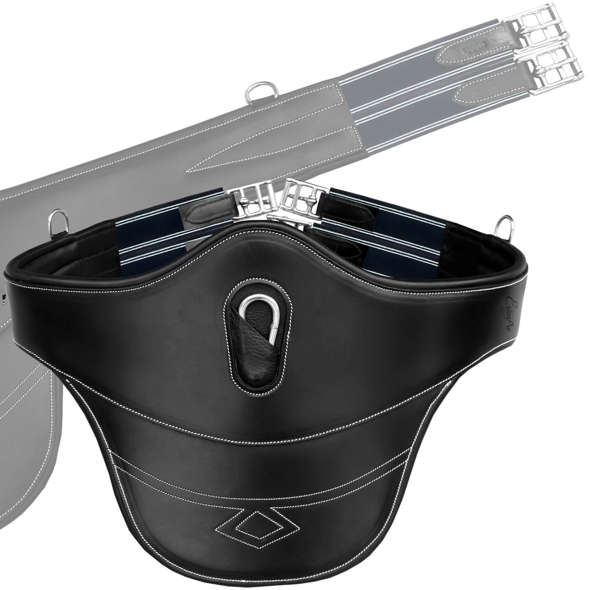 - High quality vegetable tanned leather padded fancy stitched stud girth with snap and navy elastic with white stripes.
