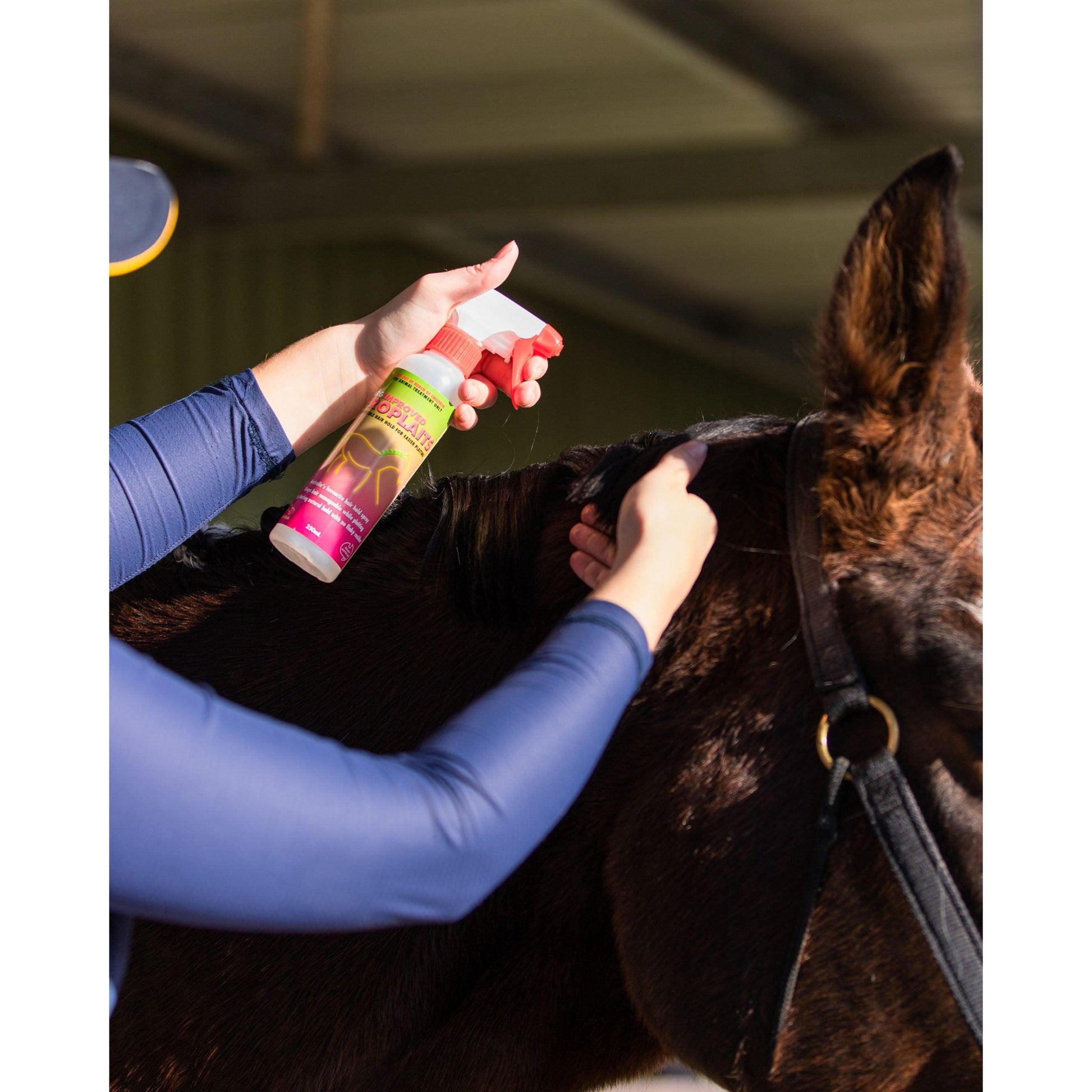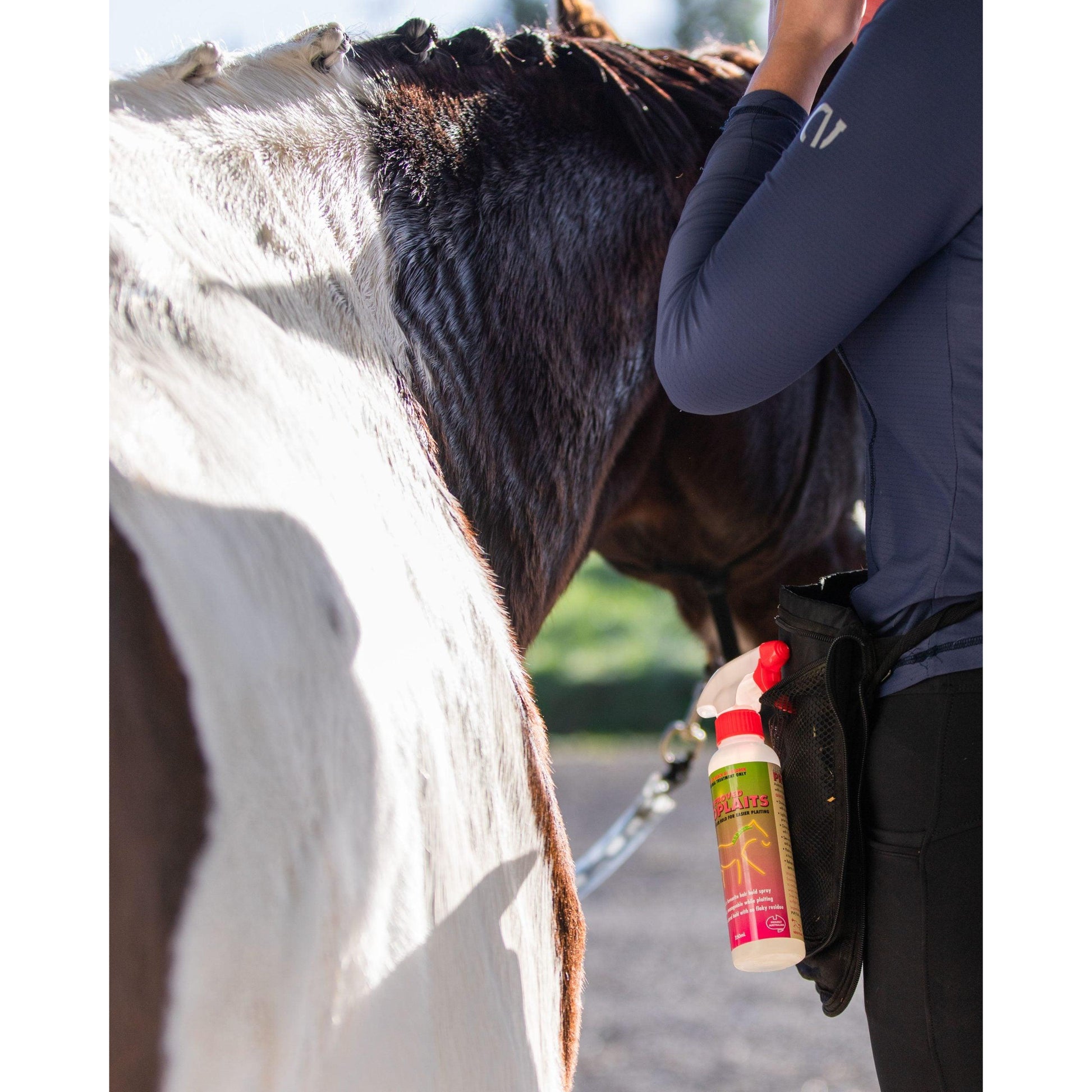 • Once the mane is plaited, a quick spray will hold plaits firmly in place – even overnight if using a neck rug or hood – ready for your competition.