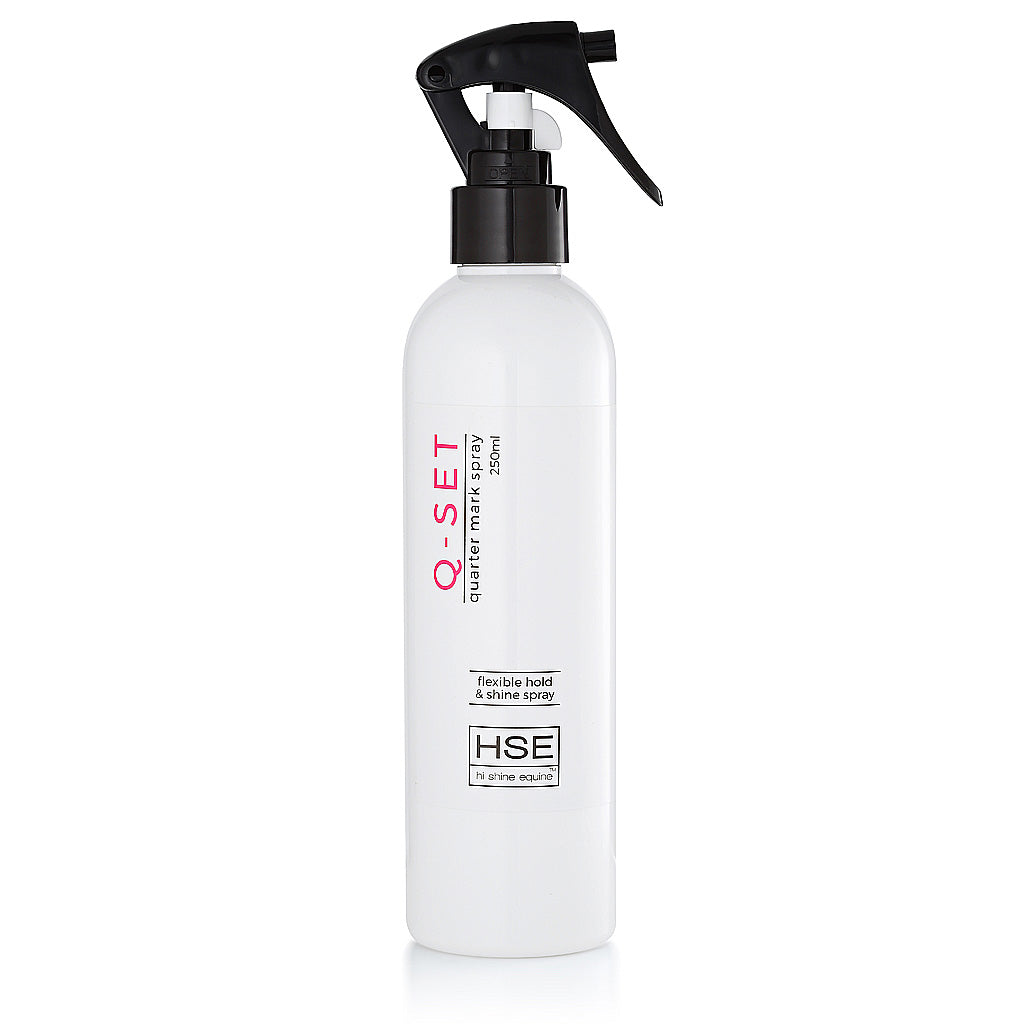 HSE Q-Set Quarter Mark Spray is a light, flexible hold setting spray designed specifically for equine coats to help you create professional, sharp quarter marks and sharks teeth patterns on horse hair.