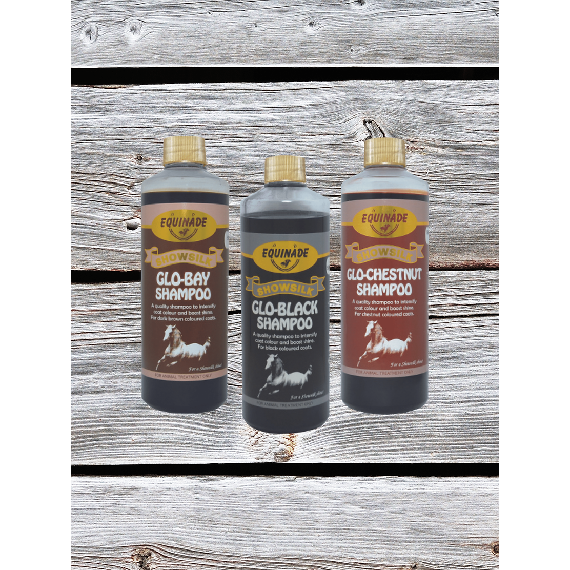 Equinade Showsilk Glo-Colour Shampooshave been formulated to give an even depth of colour and add a healthy glow to coats. The rich colours and shine boosters will revitalise dull and patchy-coloured coats to create even tones and a bright, lasting shine. The shampoos have been pH balanced to be gentle enough to use on many show animals; including horses, dogs, cats, cattle,