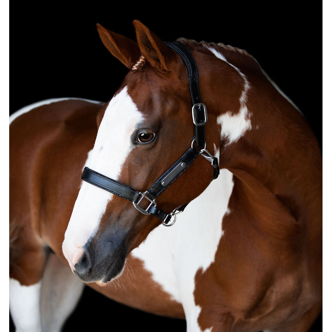 A standout luxe halter...enter the Vegas. Black glitter trim over the headpiece and the noseband make this halter more than a little special.